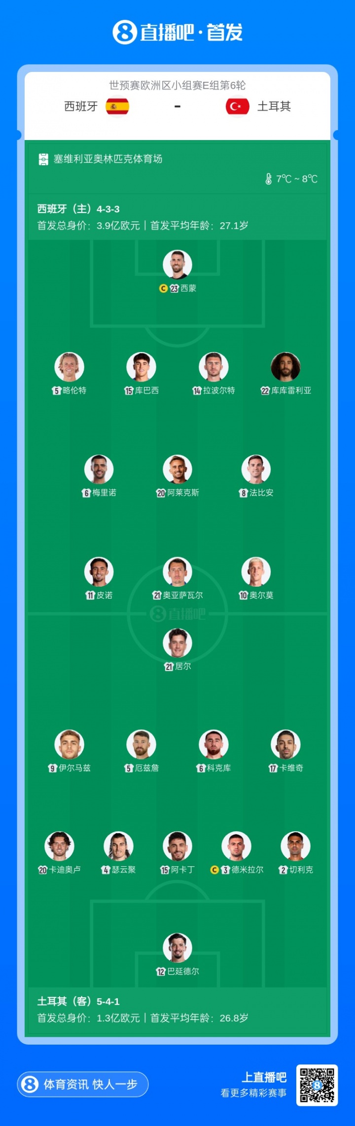 西班牙vs土耳其首发:皮诺、奥尔莫先发,居莱尔、伊尔迪兹均替补